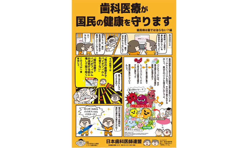 配布資料 【ポスター】歯科医療が国民の健康を守ります 歯周病は薬では治らない?編 ※印刷して歯科医院の診療室などにご自由に掲示ください。ポスターの無断改変はお断りしております。 【連盟活動啓発ポスター】歯科医療が国民の健康を守ります 特別対談財政健全化と国民のウェルビーイング歯科医療の...